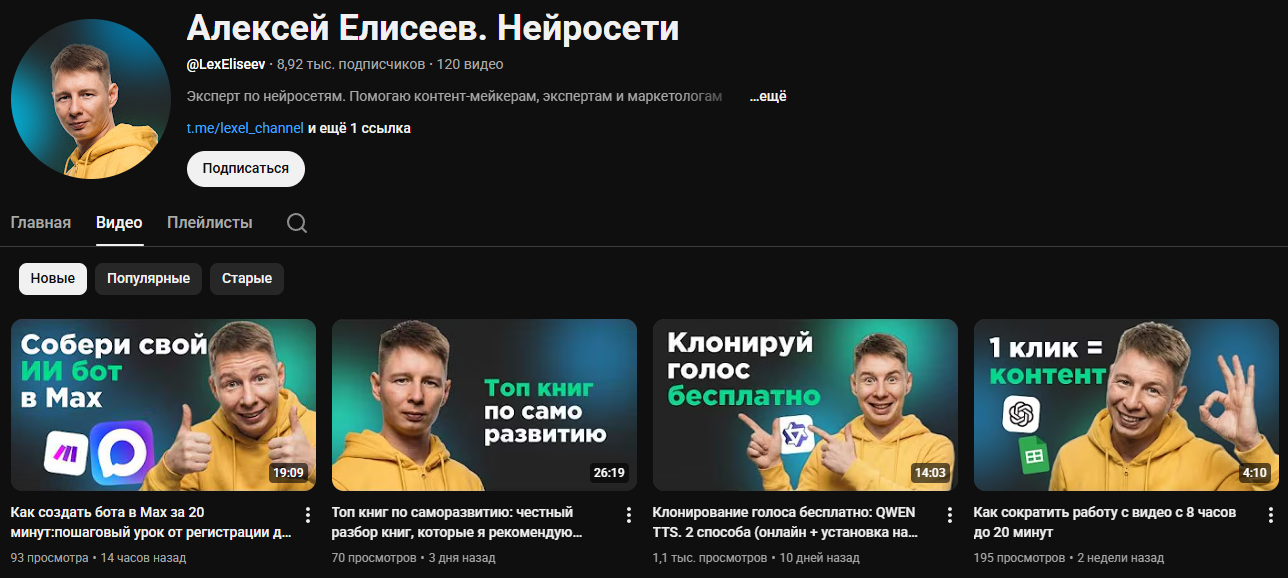 На ютуб-канале ситуация с количеством подписчиков лучше, но активность еще хуже. На многих роликах 100-200 просмотров, что для 8-тысячной аудитории недопустимо. Видео снова об ИИ и их возможностях: опытные пользователи вряд ли узнают здесь что-то новое.