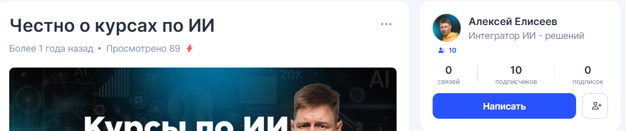 Полноценных отзывов об АИ курсе Алексея Елисееве в интернете вообще не оказалось. Нам удалось обнаружить только один материал, где автор со своего же аккаунта, по сути, рекламирует и хвалит себя, при этом позиционирует это как мнение клиента.