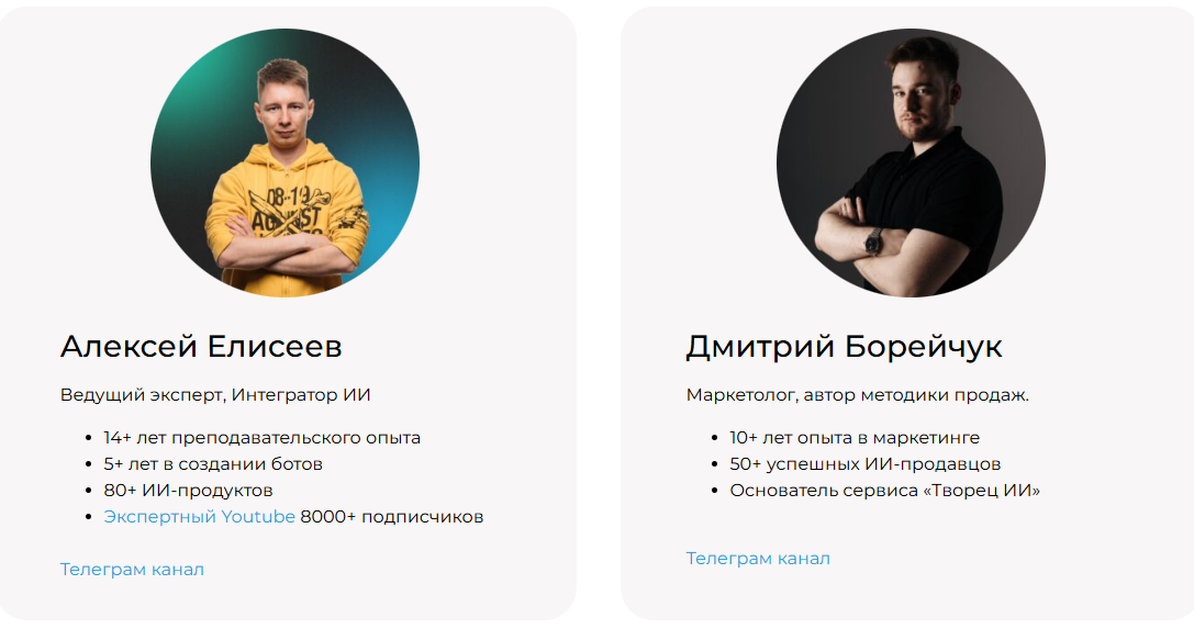Спикерами выступят сам Алексей Елисеев и некий Дмитрий Борейчук, к компетентности обоих есть вопросы. Основатель, например, заявляет о 14+ годах предпринимательского опыта, но ни об одном его бизнесе мы не нашли информации. То же самое касается и слов о создании ботов в течение 5 лет и 80+ ИИ-продуктах. Борейчук не отличился от коллеги. О нем тоже тут несколько громких заявлений, но реальных доказательств озвученным регалиям нет.В соцсетях ментор заявил о себе только 2-3 года назад. Lexel Channel в Telegram был создан в октябре 2023-го года. За все время на группу подписалось всего 1,8 тыс. подписчиков, а это довольно низкий результат, тем более для человека, связанного с маркетингом.