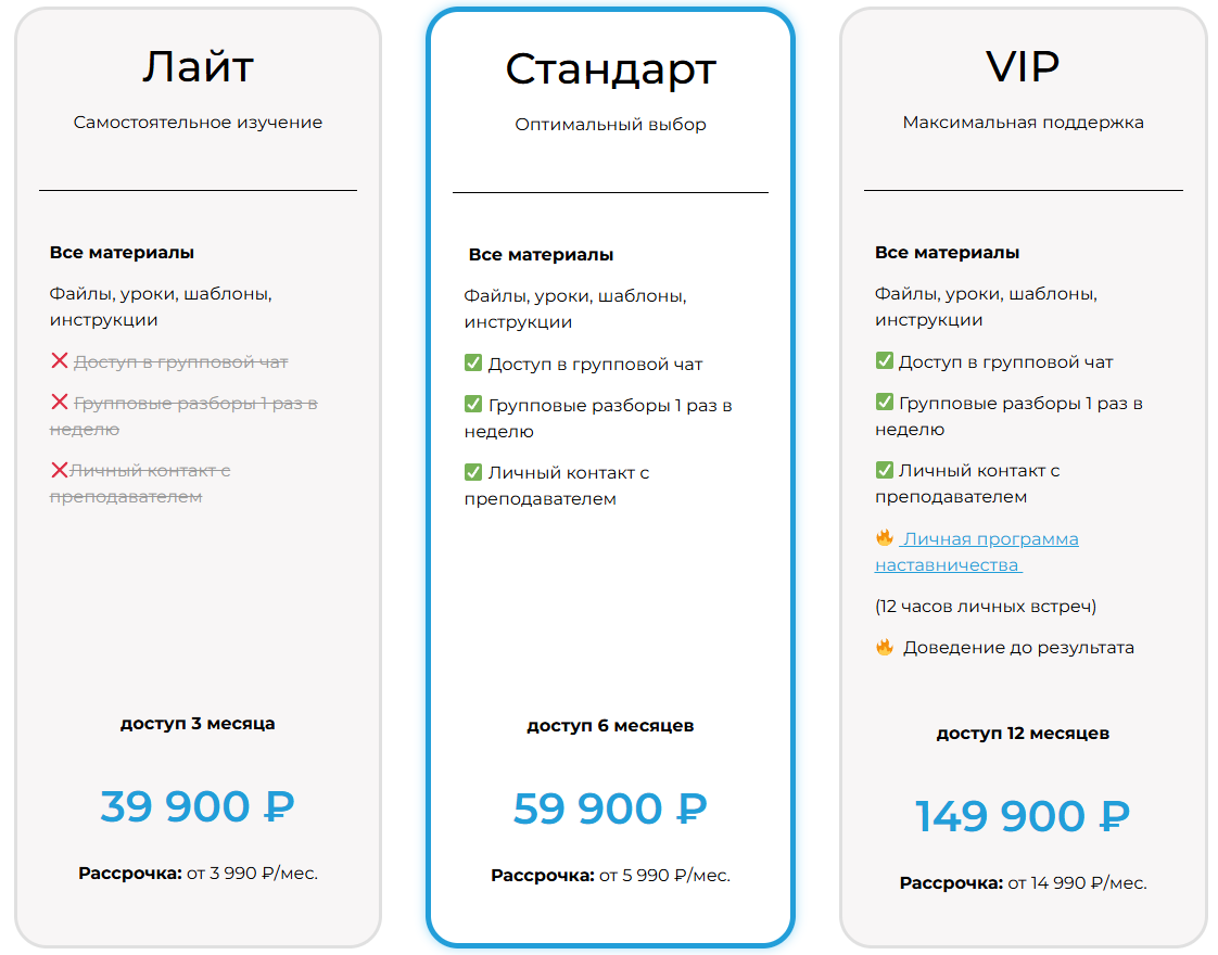 Полноценно пройти программу можно только по тарифу “Стандарт” уже за 59900. В VIP же входит индивидуальное наставничество с доведением до результата, но такой вариант почти в 3 раза дороже предыдущего.