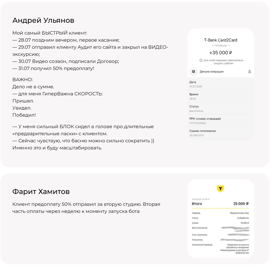 Кейсы учеников здесь представлены как краткие описания и скриншоты непонятных банковских переводов. Верифицировать подобное невозможно, а верить на слово не стоит.