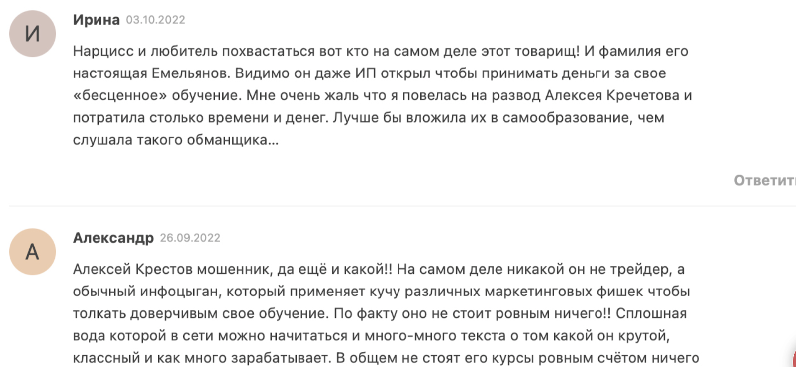 Для получения более детальной информации о честности и перспективах сотрудничества стоит почитать отзывы о трейдере Алексее Кречетове. И здесь все чаще подписчики недовольны героем материала, называют его мошенником и инфоцыганом. Причиной является высокая стоимость доступа к клубу и отсутствие на нем реально полезной информации.