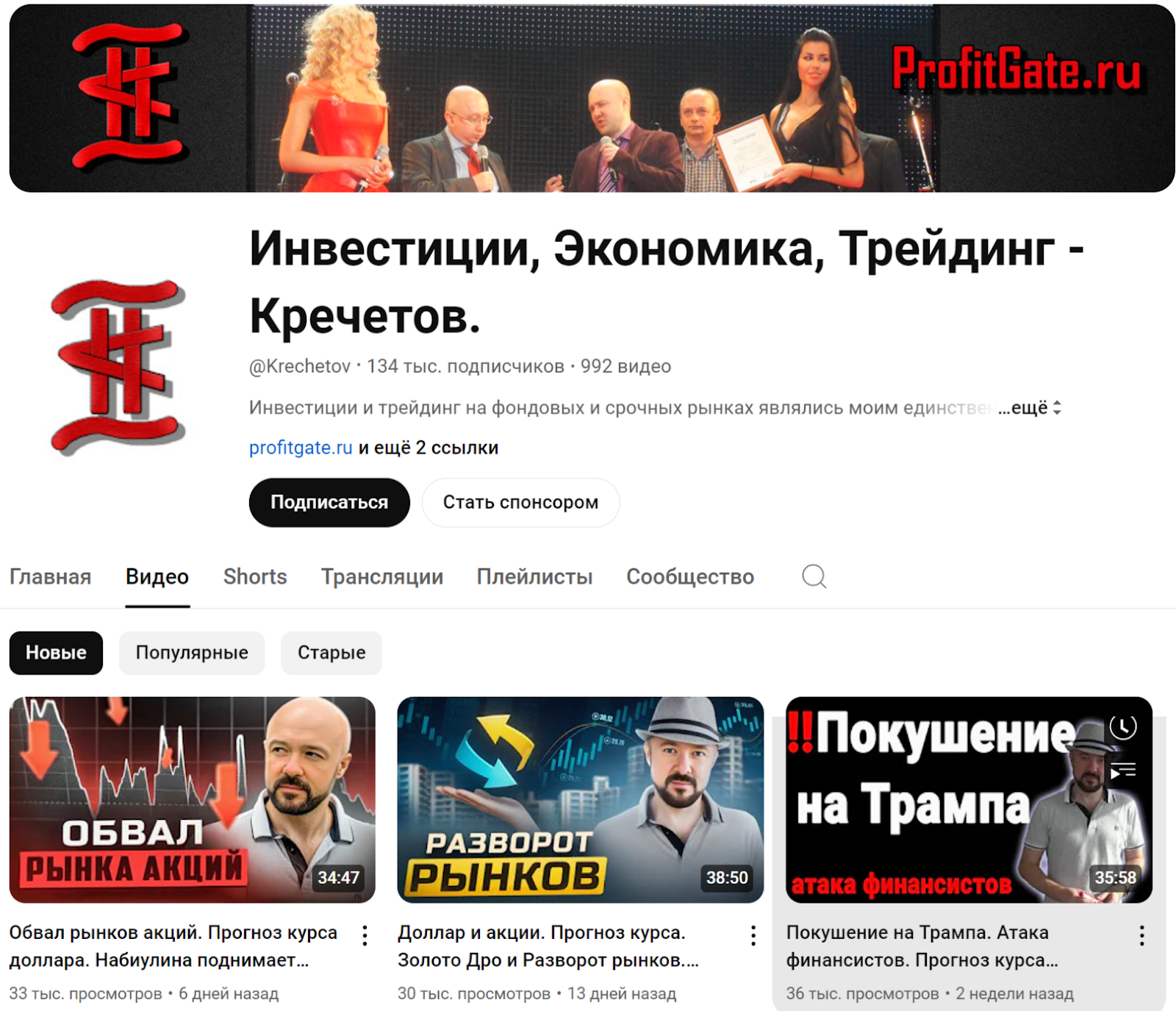 Еще один проект Кречетова — инвестиции, экономика, трейдинг в Ютубе. Канал доступен по ссылке Krechetov и работает с сентября 2013 года. Здесь приводится около 1000 роликов, а число фолловеров на текущий момент — 134 тысячи. При этом количество просмотров находится на уровне 28,8 млн. человек.