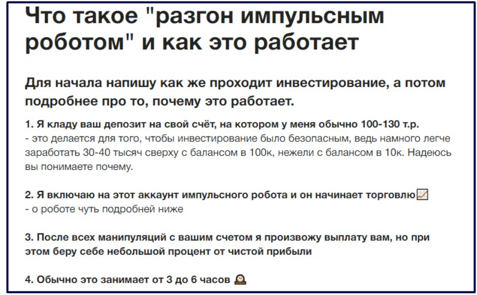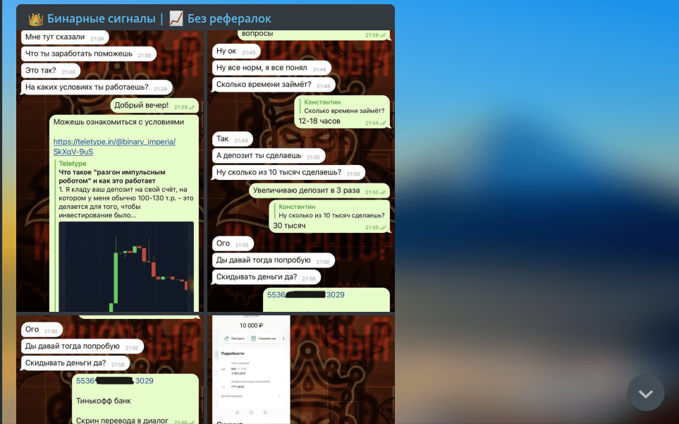 Для тех, кто не хочет пользоваться предлагаемой торговой площадкой, руководитель канала Бинарный император предлагает возможность платного входа в ВИП-чат. Стоимость такой услуги составляет 4 тысячи рублей, доступ к группе – пожизненный.Ну и вишенкой на торте служит предлагаемая услуга по разгону депозита Алексеем Платоновым при помощи импульсного робота. Минимальный платеж для этой услуги составляет 10 тысяч рублей. Платонов обещает увеличить сумму депозита минимум в 3 раза за 3-6 часов. За это берет себе процент от полученной прибыли. Наши эксперты убеждены, что это лишь еще одна вариация типично мошеннической раскрутки торгового или игрового счета. У человека берут деньги, а потом либо сразу добавляют в черный список, либо пытаются вытянуть из жертвы еще больше. В реальности увеличить капитал в 3 раза за такое короткое время – невозможно.