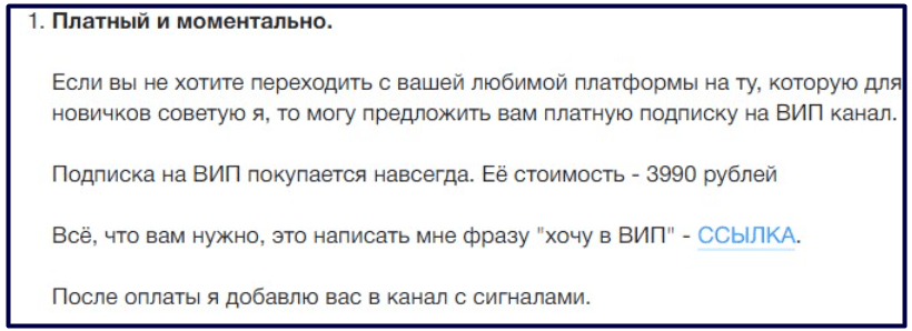 Также есть возможность попасть в закрытый ВИП-чат как на платной, так и на бесплатной основе. В этой группе Алексей обещает публиковать самые точные сигналы, которые обеспечат максимальную прибыль. Для бесплатного попадания в закрытую группу человека просят выполнить ряд условий: