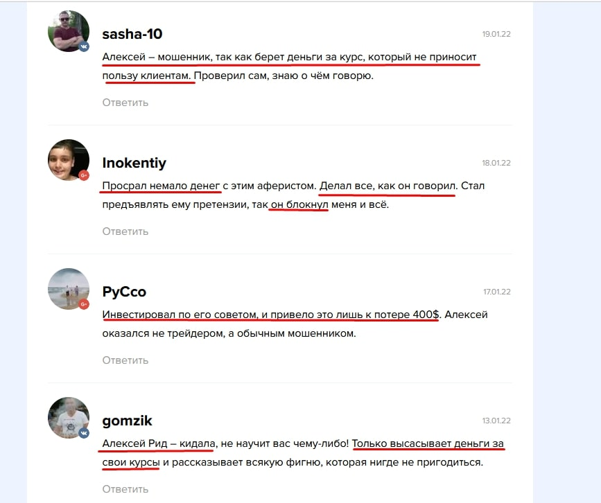 Отзывы об инвестициях с Алексеем Ридом на независимых ресурсах негативные. Клиенты пишут, что все курсы наставника — развод на деньги и пустая трата времени. Сам автор уже уличен во лжи и мошенничестве. В статье поговорим о том, кто такой Алексей Рид и стоит ли покупать платные услуги на его сайте alexrid.ru.