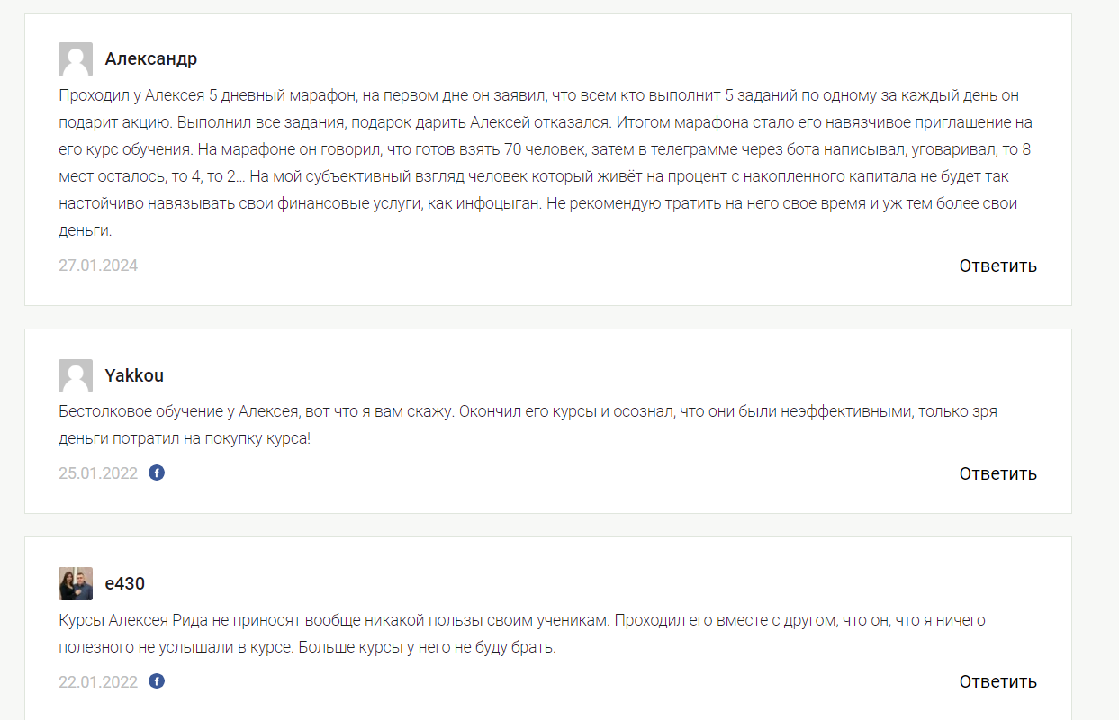 Ютуб Капитал с Ридом и остальные социальные сети Алексей использует для рекламы своих платных курсов. Но их качество оставляет желать лучшего, как следует из отзывов о наставнике. Помимо негатива от учеников есть и другие факторы, из-за которых проекту не стоит доверять:
