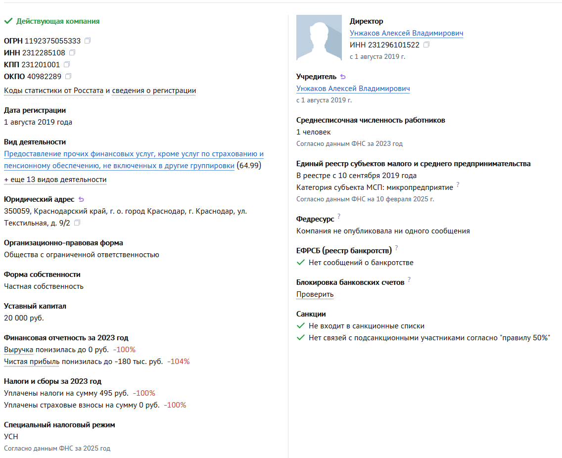 Она специализируется на помощи инвесторам в поиске недвижимости для инвестиций. Изучив налоговые данные о деятельности данной компании, можно прийти к выводу, что либо Унжаков уклоняется от уплаты налогов, либо работа его компании никому не интересна:
