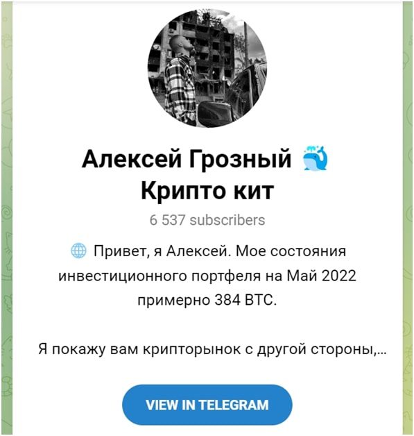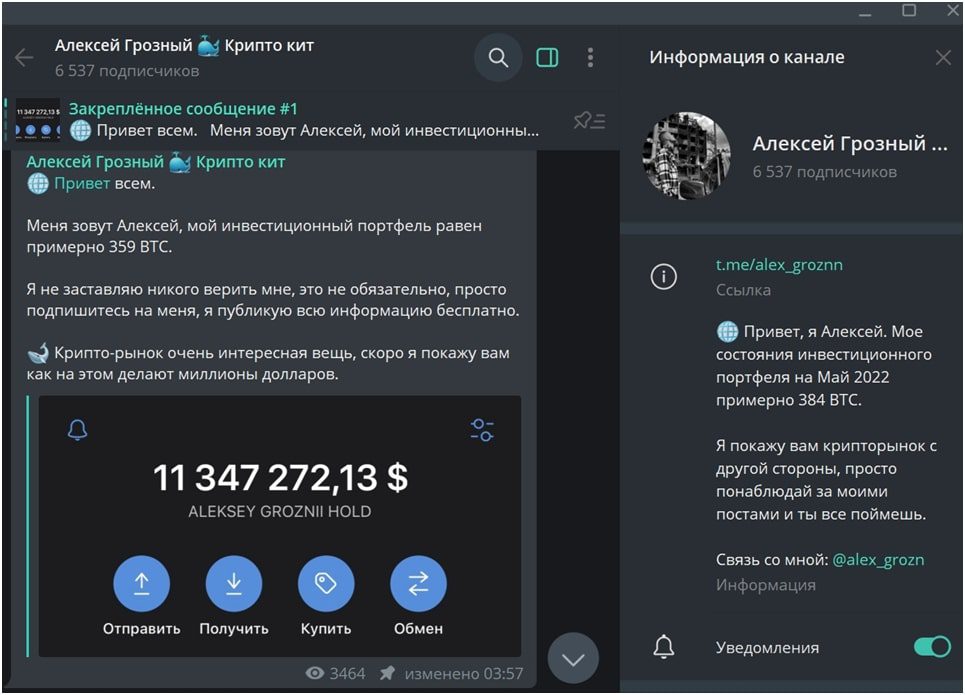 Создатель нескольких Телеграм каналов трейдер Алексей Грозный утверждает, что размер его инвестиционного портфеля составляет 359 биткоинов, а это более 11 млн. долларов.