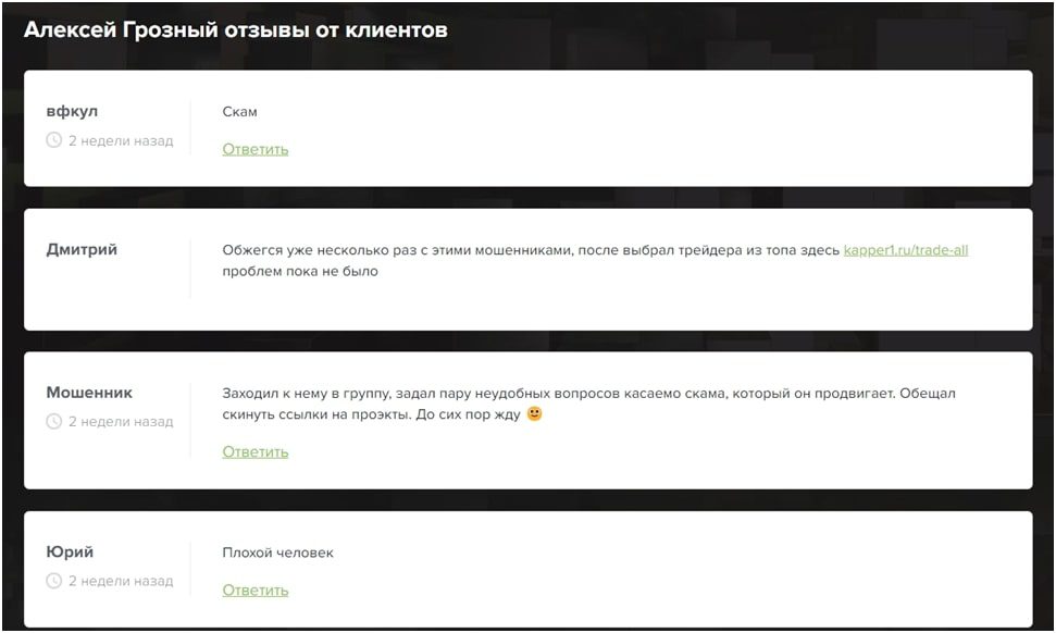 В интернете о трейдере Алексее Грозном отзывы не слишком распространены. Однако те, которые встречаются негативные с обвинениями в публикации сигналов для слива депозита.