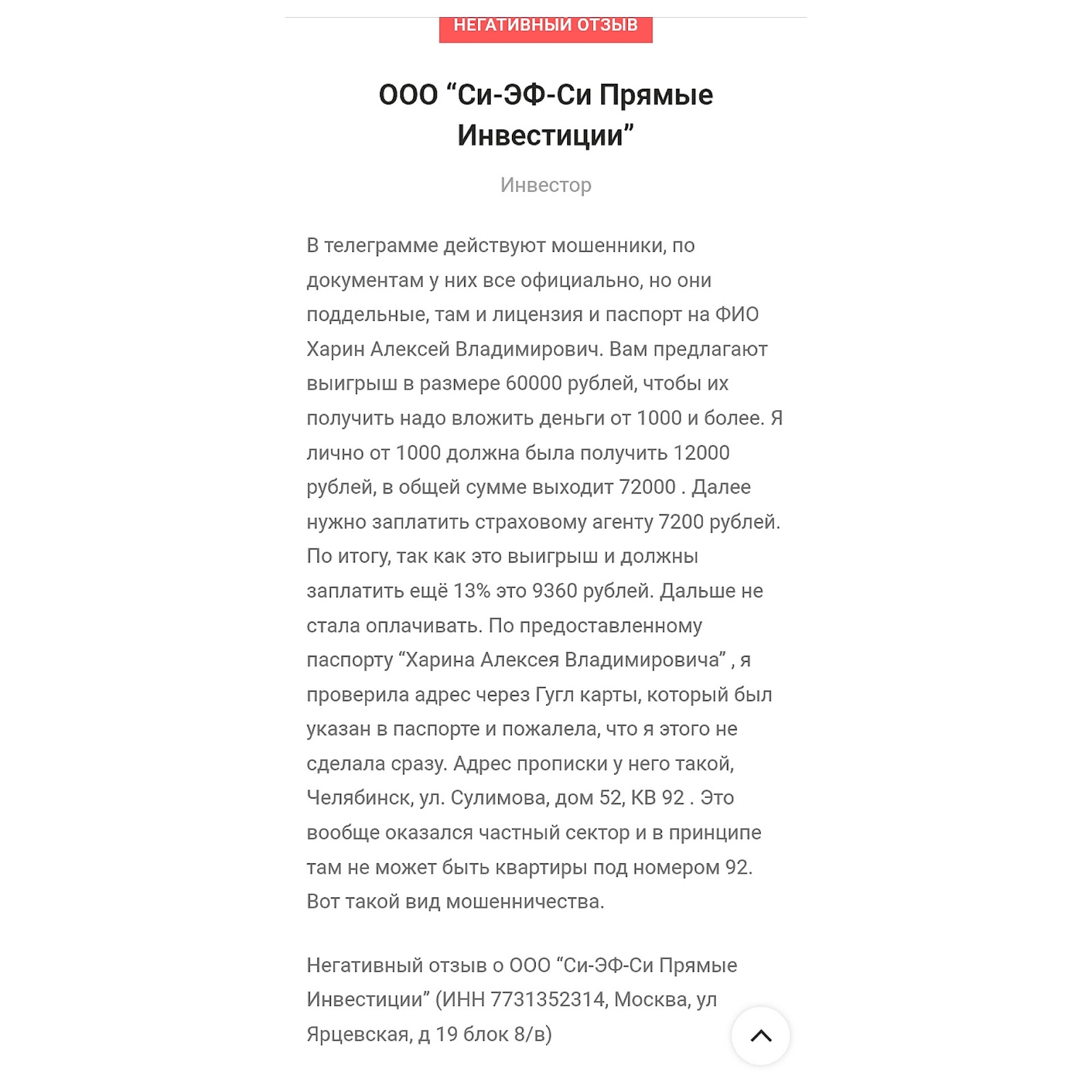 На сайте и в отзывах Алексей Харин, основатель ООО Си Эф Си Прямые Инвестиции, предупреждает о данных мошенниках.