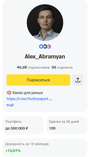 На Тинькофф пульс alex abramyan на данный момент имеет доходность от инвестиций в 15% за 12 месяцев, а его портфель не превышает 500 тысяч рублей, что странно якобы для профессионального инвестора.