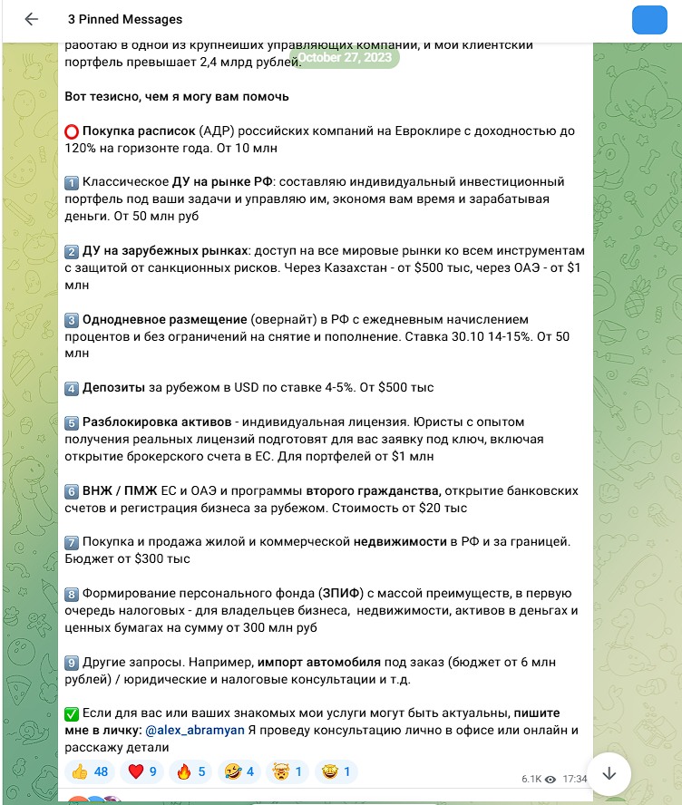 Как вы можете заметить, автор имеет заоблачный порог входа, что затрудняет взаимодействие с ним. Также для получения любых подробностей необходимо напрямую связываться с владельцем канала.