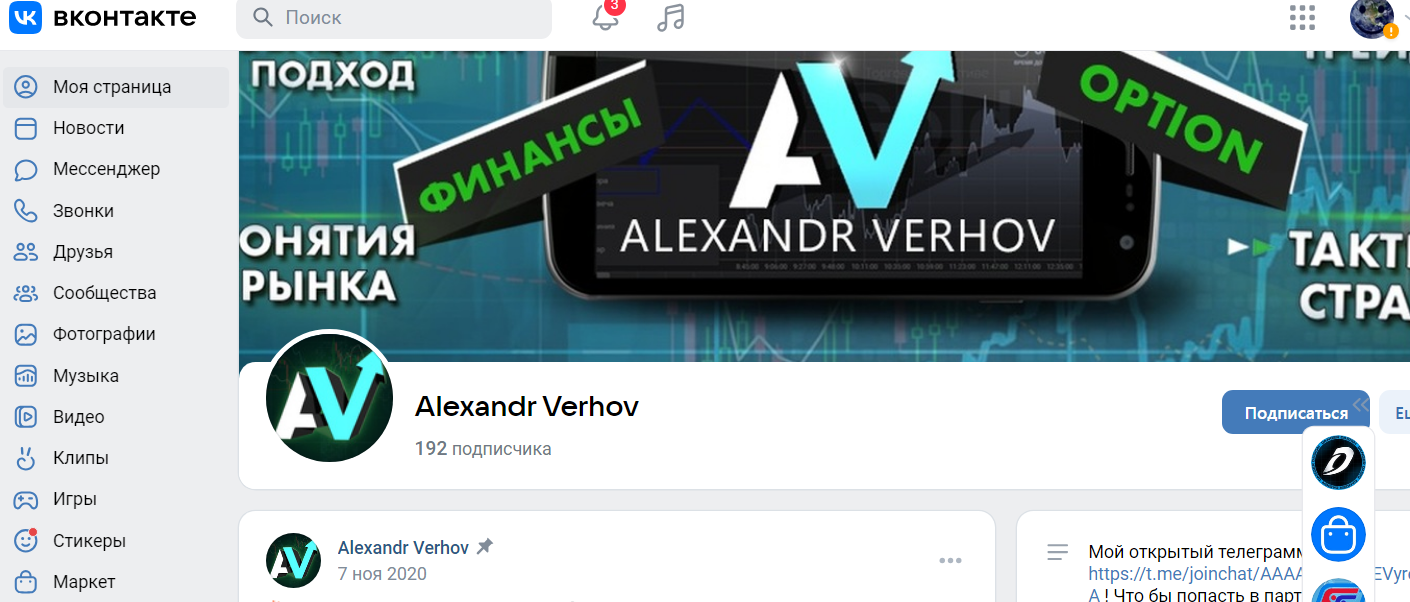 Alexandr Verhov – биржевой торговец, который работает и обучает своих клиентов бинарным опциям, их анализу и прогнозам. Проект не имеет отдельной платформы. Общение с клиентами трейдер ведет исключительно в социальных сетях. Заливаемый контент однообразный.