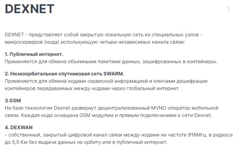 Итак, по легенде, некая команда девелоперов аж с 2017 года корпела над созданием революционной технологии Web 4.0 под названием DexNet. Фишка этой разработки – использование сети спутников компании Swarm (той самой, что когда-то приглянулась Илону Маску) для обеспечения «интернета вещей». Если же отбросить всю техническую мишуру, то перед нами некий аналог Starlink, только с более скромной пропускной способностью.
