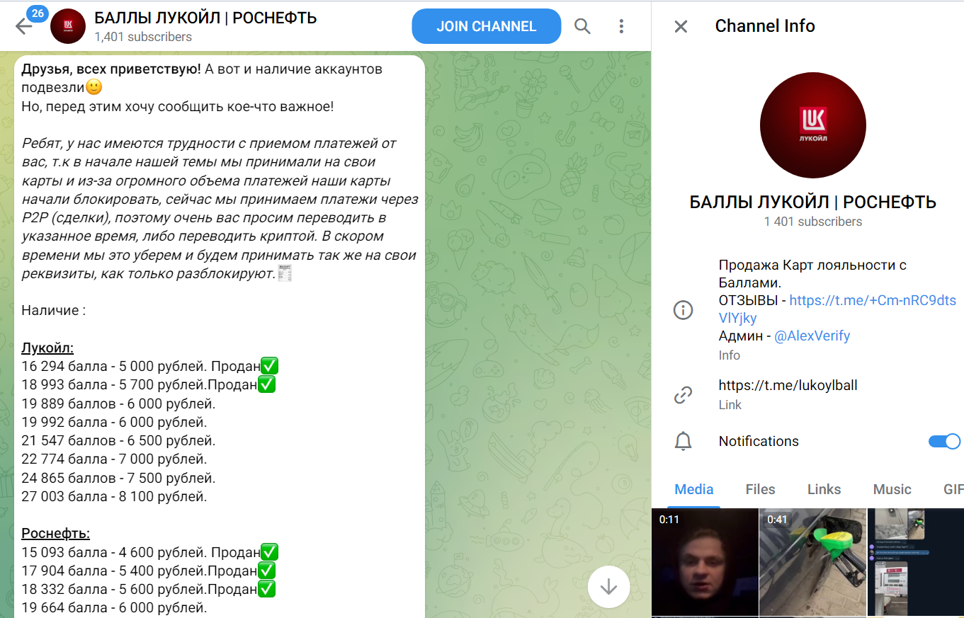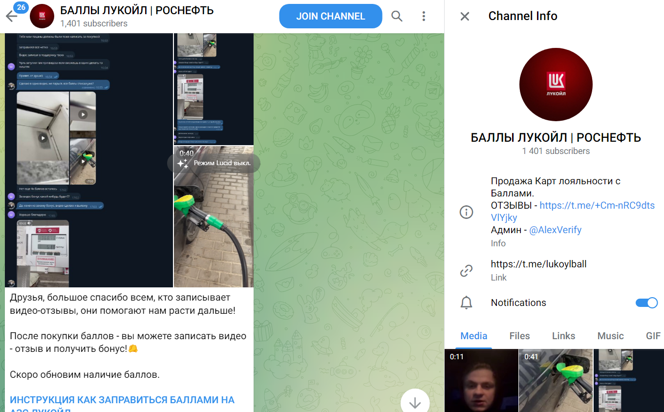 Alexverify — это Telegram-аккаунт админа сообщества Баллы Лукойл Роснефть, в котором предлагают приобретать карты лояльности по минимальной стоимости. Алексей уверяет подписчиков в том, что за баллы можно оплачивать услуги на АЗС, и использовать данные карты безопасно. В статье мы расскажем о деятельности проекта правду.