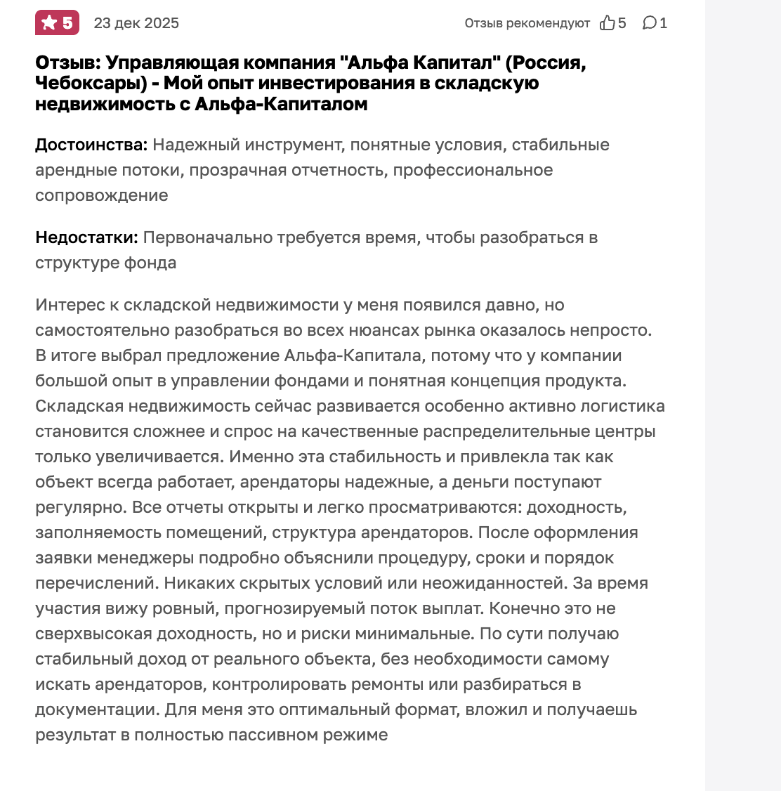 Так, Альфа Капитал Складская Недвижимость 2 это не консервативный инструмент, а долгосрочная инвестиция с рисками ликвидности, сроков и фактической доходностью. Основные разочарования инвесторов связаны не столько с самим продуктом, сколько с завышенными ожиданиями. Плюсы: