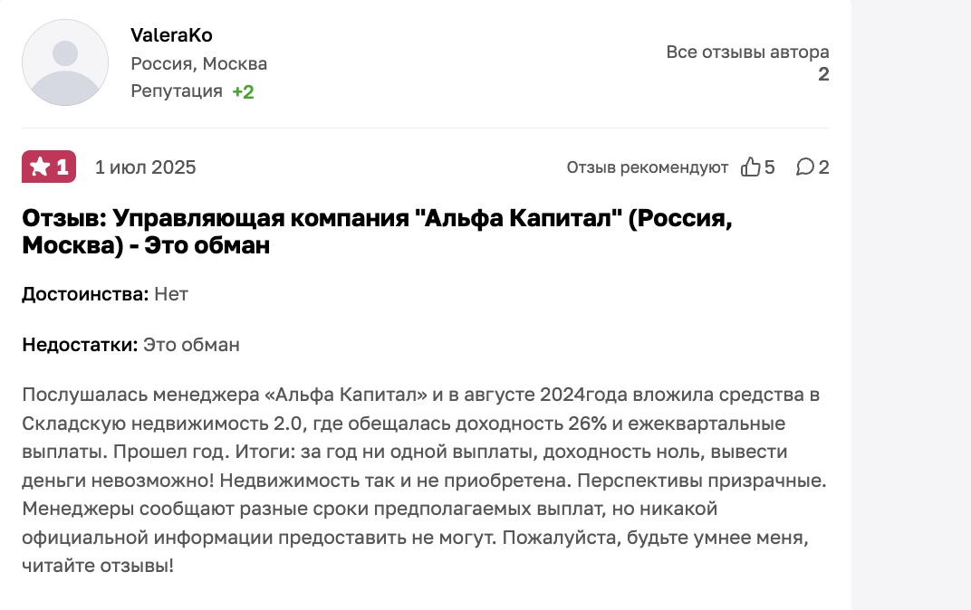 Одновременно присутствуют и негативные отзывы об Альфа Капитал Складская Недвижимость. Некоторые участники сообщают о задержках выплат, расхождении обещанных сроков и отсутствие четкой информации о статусе объектов.