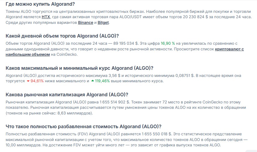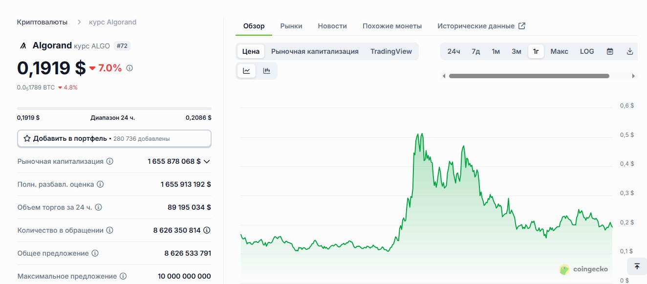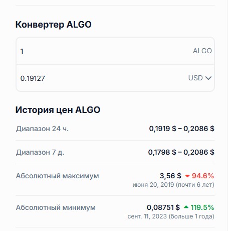 История цены у монетки довольно драматичная. Свой исторический максимум Algorand поставила на уровень $3,56, а самый низкий курс был всего $0,08751. Сейчас токен торгуется на 94,61 % ниже своего пика, но при этом уже на 119,46 % выше абсолютного дна.