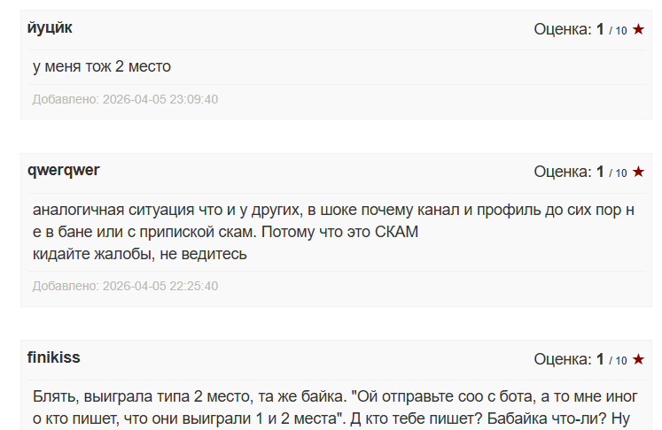 Репутация проекта на апрель 2026 года негативная. Пользователи утверждают, что админ канала вымогает деньги, а обещанные призы не отправляет.