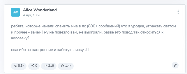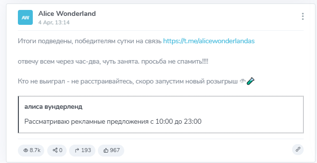 В постах, опубликованных сразу после объявления победителей, администратор неоднократно просит не спамить в личку Alice Wonderland в Тг и не проявлять агрессию по отношению к тому, кто проводит розыгрыш. Уточняется, что некоторые проигравшие участники переходят на угрозы и массовые оскорбления, заставляя админа начать жалеть о своей щедрости и доброте по отношению к аудитории.