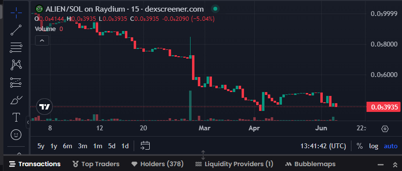 С февраля 2025 года цена ALIEN колеблется в диапазоне 0,00000020–0,00000400 доллара, при суточном обороте 6–8 тысяч долларов. Существенные колебания происходят на новостях о листинге и анонсах массовых медитаций CE-5, но коррекция следует в течение суток, что указывает на спекулятивное движение небольшими кошельками.