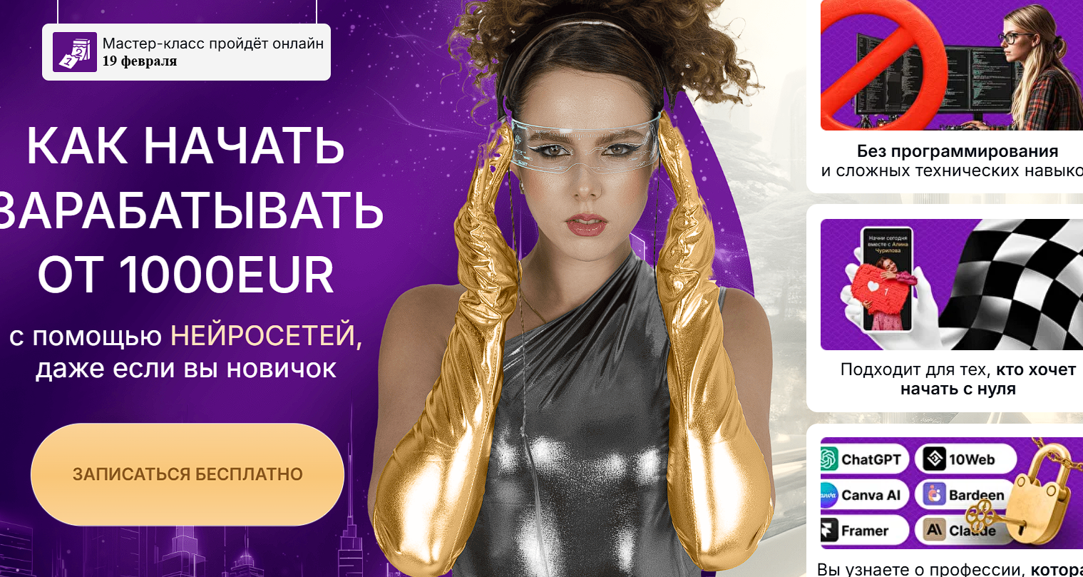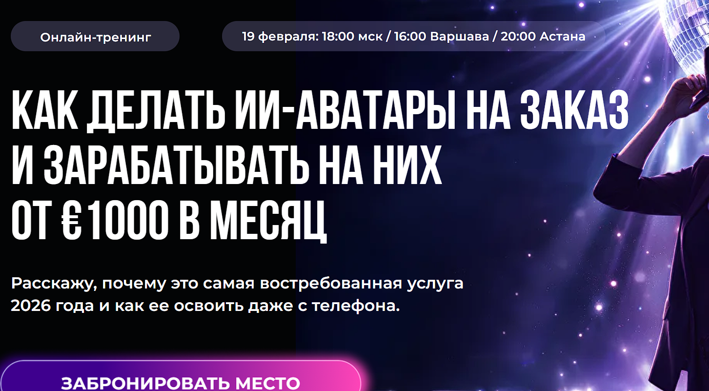 Ещё один актуальный проект – онлайн-тренинг, как делать ИИ-аватары на заказ и зарабатывать на них от €1000 в месяц. Стоимость в открытом доступе не указана – пишется, что это бесплатно.