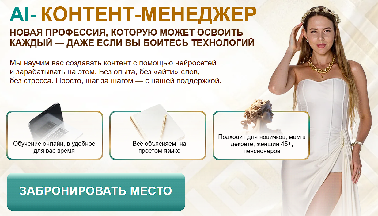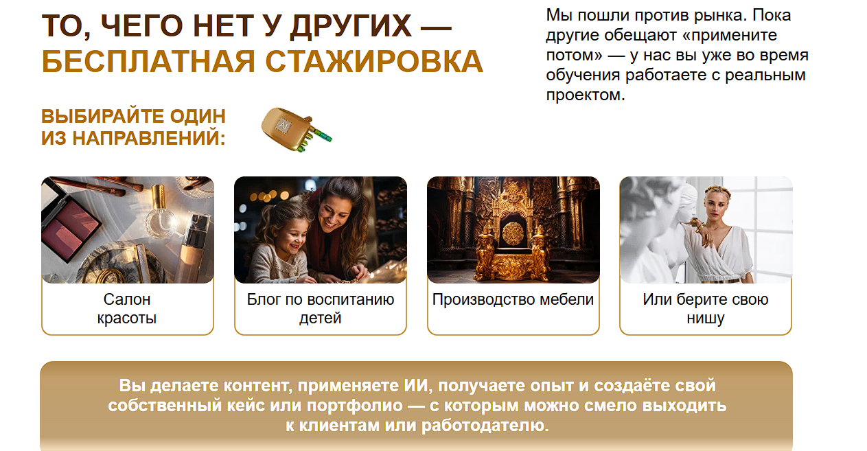 Курс «AI-контент-менеджер» учит людей пользоваться нейросетями для создания контента и зарабатывать на этом. Речь о работе с готовыми сервисами: генераторами текстов, картинок, видео и другими инструментами. Никакой технической подготовки не требуется – стать слушателем может любой.