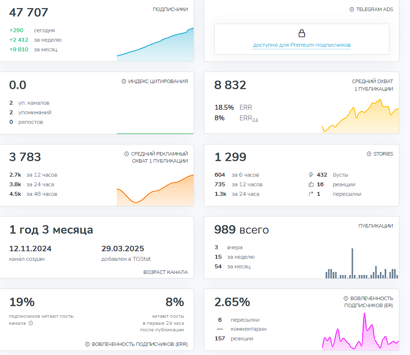 Что касается статистики канала, она выдаёт вероятное наличие накруток. Средний охват – 3783 просмотра на пост, а количество реакций – 157, что очень мало для аудитории в 47к. Обычно соотношение лайков к просмотрам в адекватных нишах колеблется от 1% до 5%, здесь же реакций 0.04%. И все это – при ежедневном приросте подписчиков: