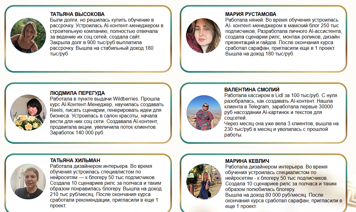 Истории женщин, которые «начали с нуля» и вышли на значительный доход. Они построены по единому шаблону: был низкий старт – прошла курс – пришёл быстрый результат.