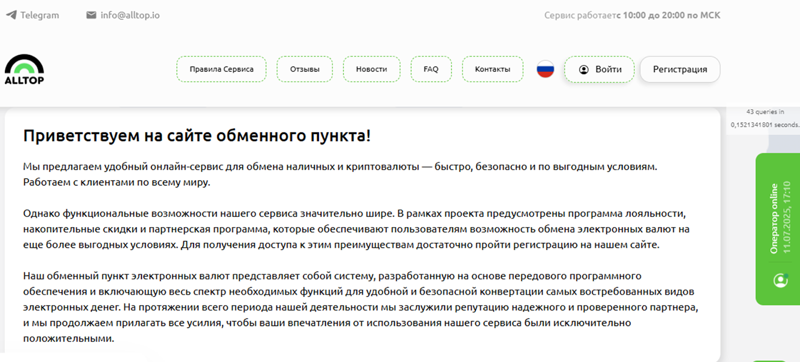 Обмены проводятся в ручном режиме. График работы сервиса с 10 утра до 20.00 по Московскому времени. Резервы валют прописаны на сайте. Техподдержка представлена чатом в Телеграме. По результатам проверки оказалось, что аккаунт активен и менеджер посещает его регулярно, запросы принимаются круглосуточно. Также связаться с менеджерами можно через чат обратной связи на сайте.