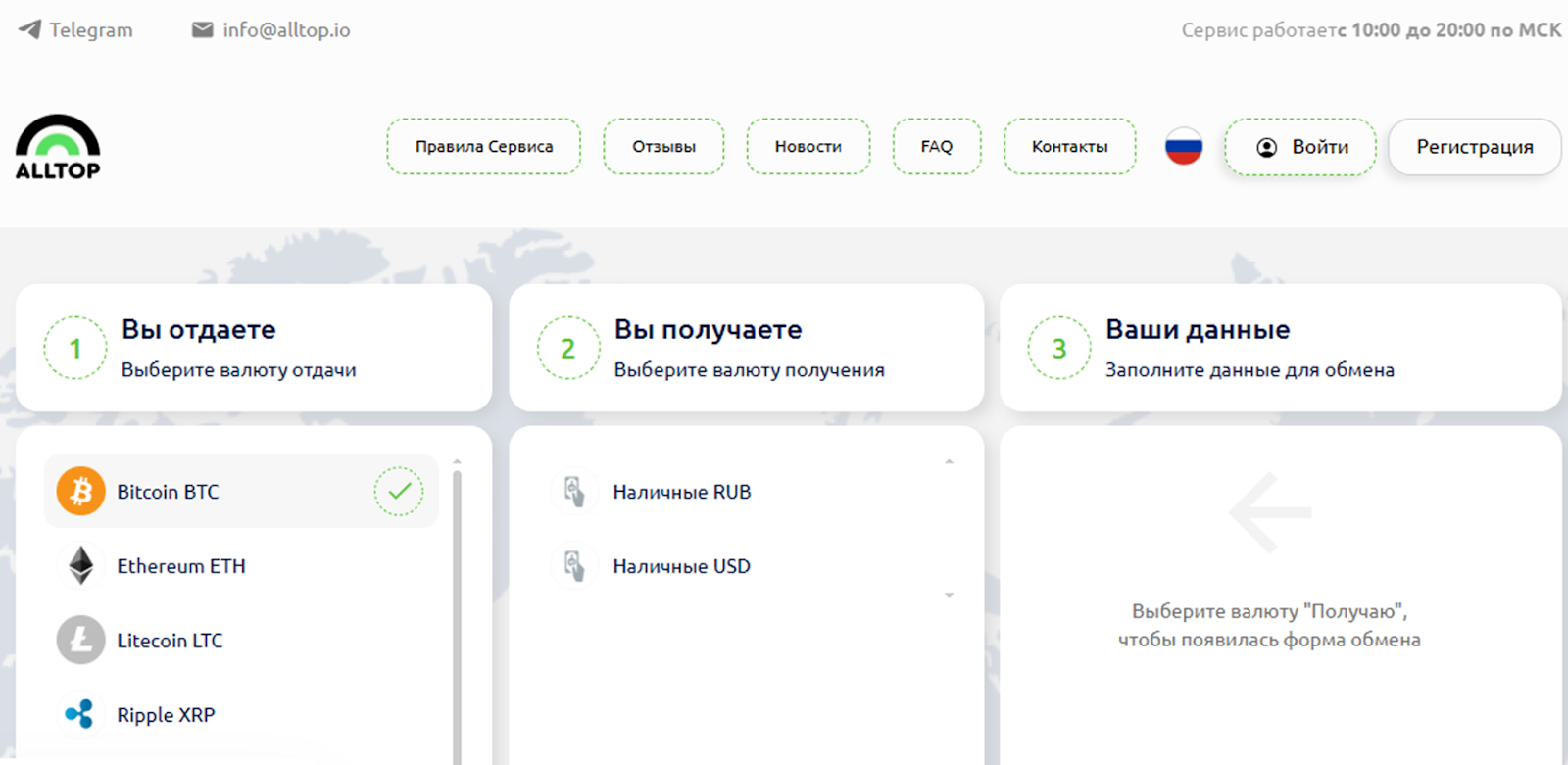 На странице сайта Info alltop io можно ознакомиться с правилами обменника. В перечне криптовалют порядка 15 самых популярных видов монет. Но стоит учитывать, что отдать можно крипту или рубли, а получить можно фиат в рублях или долларах. Комиссия зашита в курс, но она может быть пересчитана в пользу клиента если курс снизился. Разница может быть зачислена на счет пользователя.
