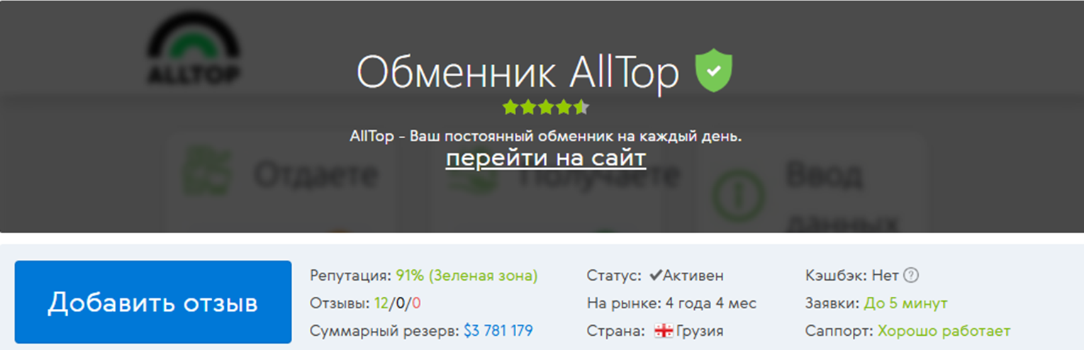 О безопасности обменника Alltop можно судить прежде всего по партнерству с крупными проектами. Одни из них – крупные мониторинги BestChange и КурсЭксперт. Но с первого сервиса Alltop был исключен не так давно. Но на КурсЭксперт проект представлен по сей день и находится там в зеленой зоне и имеет весьма высокий рейтинг доверия.