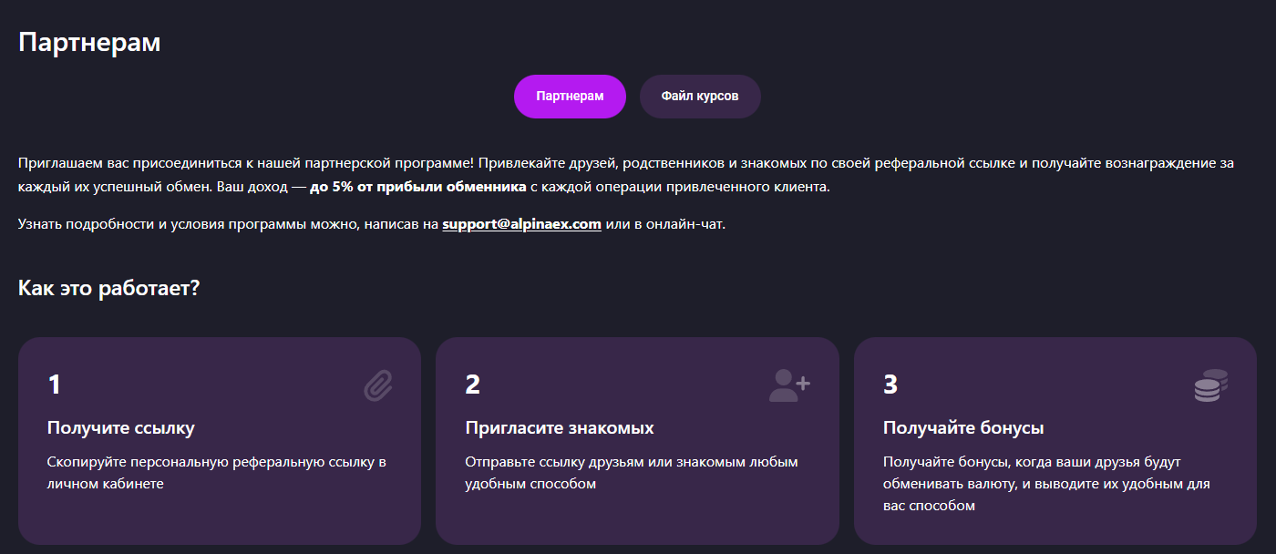 Дополнительно Alpinaex предлагает партнерскую программу. Доход составляет до 5% от прибыли обменника с каждой операции привлеченного пользователя. Реферальная система поддерживает два уровня: 5% и 30% (для мониторингов).