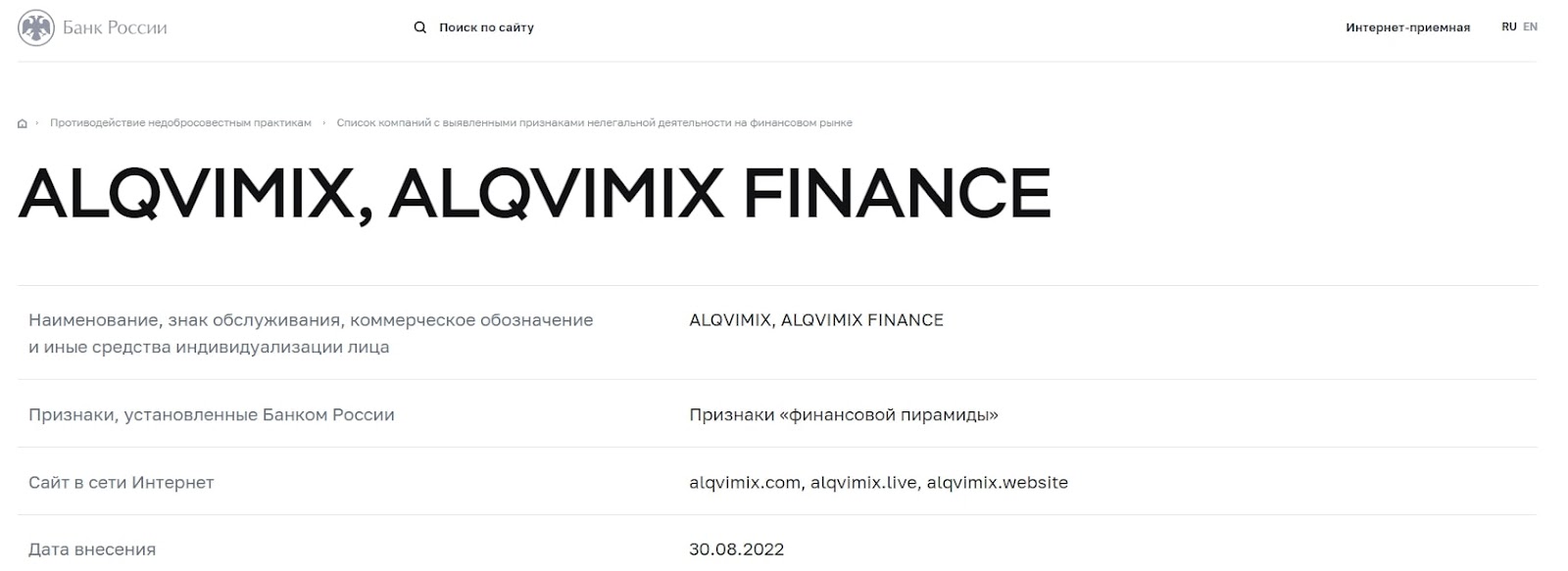 На официальном сайте alqvimix com сказано, что компания основана в 2020 году в Великобритании. При этом, сам сайт создан в 2022-м. Никаких ведений о лицензиях, выданных фирме нет. Вся юридическая информация о площадке является ложью, а адрес ее лондонского офиса – фальшивым. Банк России внес alqvimix ltd в черный список компаний с признаками финансовой пирамиды.