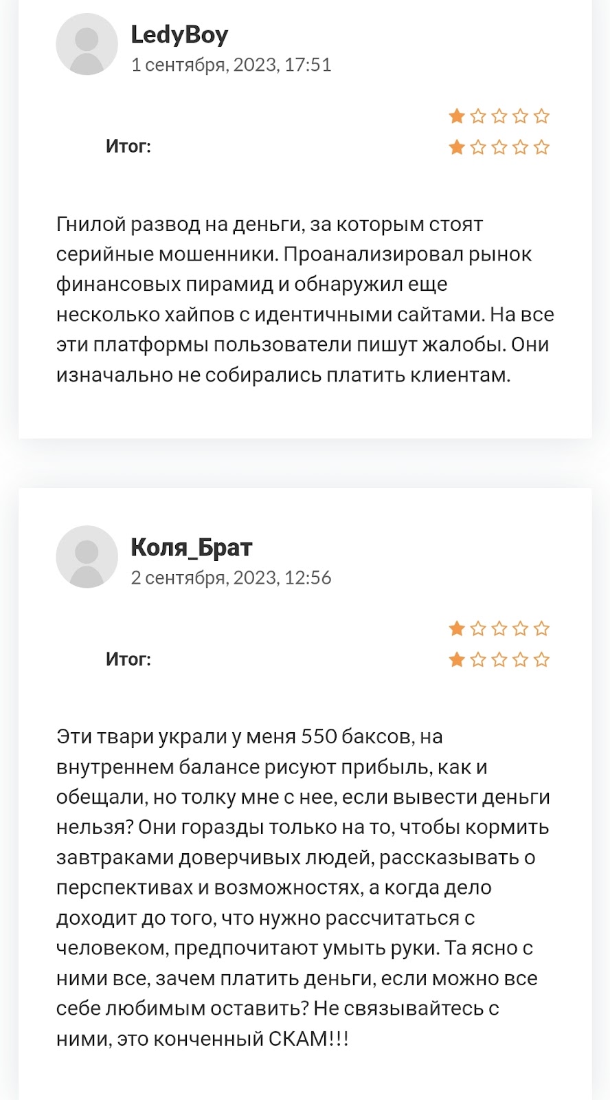 Более опытные инвесторы, ознакомившись с условиями площадки, сразу делают выводы о компании, как о типичной финансовой пирамиде и стараются предупредить других пользователей об опасности.