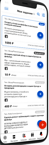 На сайте присутствует скриншот, который дает представление о сути сервиса. Пользователь должен выполнять задания, связанные с продвижением товаров, услуг и сервисов. Например, писать отзывы в Facebook и Instagram, а также делать репосты и рекомендации. Вознаграждение составляет от 10 до 1000 руб. за каждое действие.