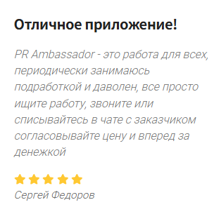 На собственном сайте компании выложены позитивные отзывы о приложении для заработка «Амбассадор», но они наверняка являются заказными. Один из клиентов якобы доволен подработкой через этот сервис и называет его выгодным для всех.