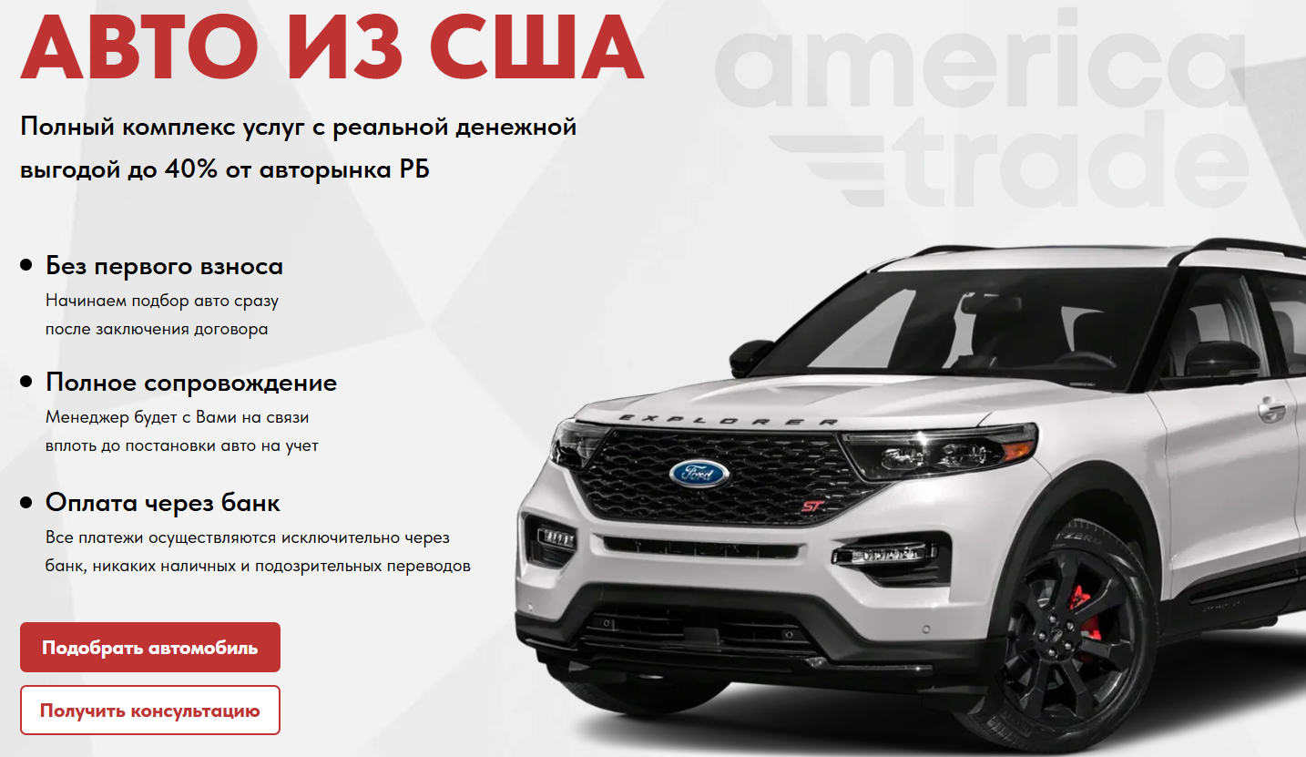 На официальном сайте Америка Трейд не так уж много информации. Главное, что здесь упоминают, – это возможность приобрести машину на 40% дешевле, чем в Беларуси. С клиентов также якобы не требуют никаких первых взносов, а оплатить все можно через банк, что тоже дает дополнительные гарантии клиентам.