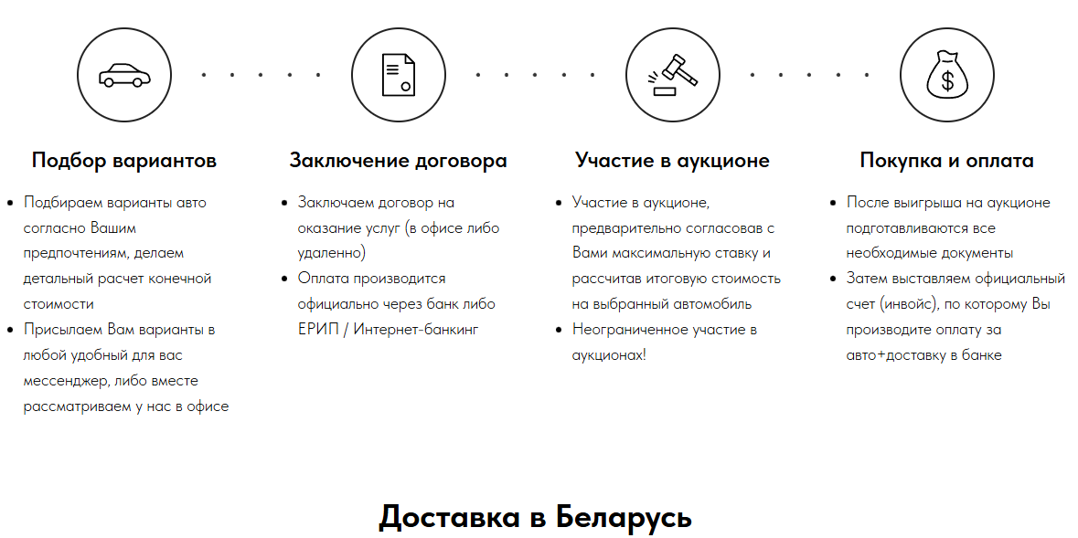 Процесс получения автомобиля тут тоже описан. Из сомнительных моментов выделим пункт “участие в аукционе”. Оказывается, что машина приобретается на торгах, а значит, установленные цены являются фейковыми, либо просто приближенными к реальным. На деле клиент можно отдать и гораздо больше, не учитывая еще и оплату услуг самой компании.