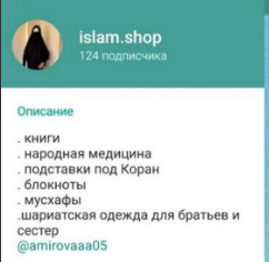 Канал работал как интернет-магазин религиозных товаров. За проектом стояла девушка Марина Гаджиева. Ее ник в мессенджере – amirovaaa05.