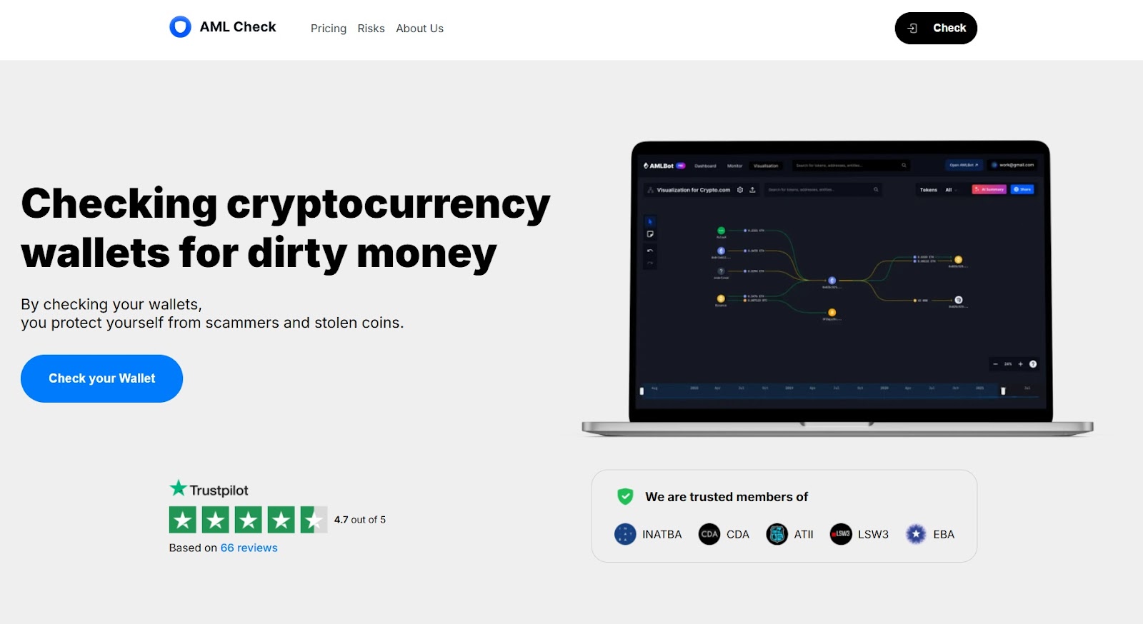 Сайт в целом отличается отсутствием каких-либо доказательств представленной информации. На главной странице указано, что сервис является доверенным источником на TrustPilot. Однако ссылка на якобы реальные отзывы открывает внутреннюю страницу AML Check.