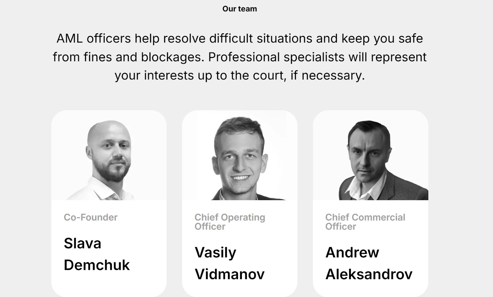 На сайте AML Check можно увидеть всю необходимую информацию о создателях ресурса. Список сотрудников указан на главной странице. Однако доступна только текстовая информация и фотографии. Ссылки на реальные аккаунты отсутствуют, поэтому невозможно проверить, действительно ли это реальные люди.