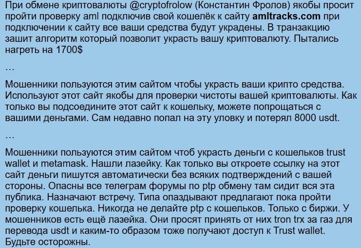 Оба сервиса вызывают у русскоязычных пользователей недоверие. Отзывы на amltracks com содержат жалобы на кражу пользовательских данных. По словам клиентов, после подключения кошелька неизвестные пытаются украсть с баланса деньги.