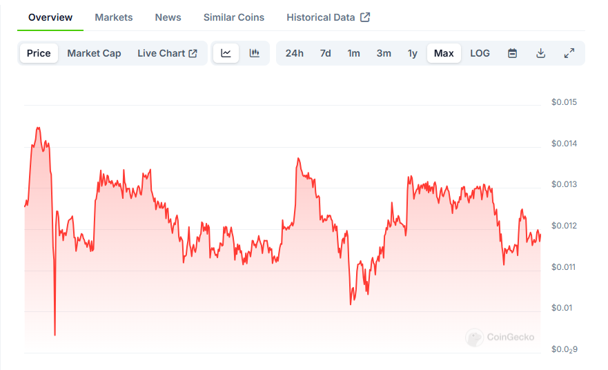 Курс крипты Amocucinare нестабильный. Наблюдаются резкие скачки стоимости в течение дня. Самая высокая цена токена была зафиксирована 25 ноября 2024 года на уровне 0,01469843 доллара. Но на следующий день стоимость монеты упала до своего исторического минимума — 0,0094254 доллара.