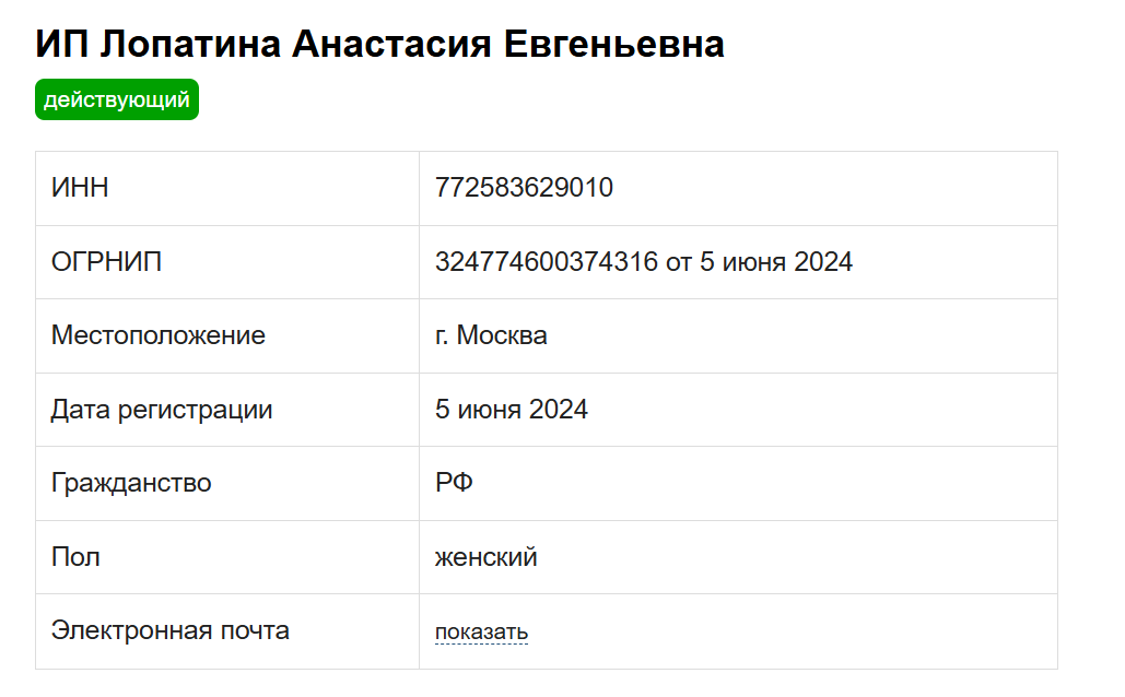 На этом фоне не совсем ясно, какое отношение имеет Лопатина Анастасия Евгеньевна к рассматриваемому проекту. Не исключено, что это реальное ФИО героини материала. Также стоит отметить, что до 13 апреля 2021-го девушка вела деятельность как Гусева Анастасия Евгеньевна. Скорее всего, фамилию пришлось поменять после замужества. Не исключено, что это происходило несколько раз.