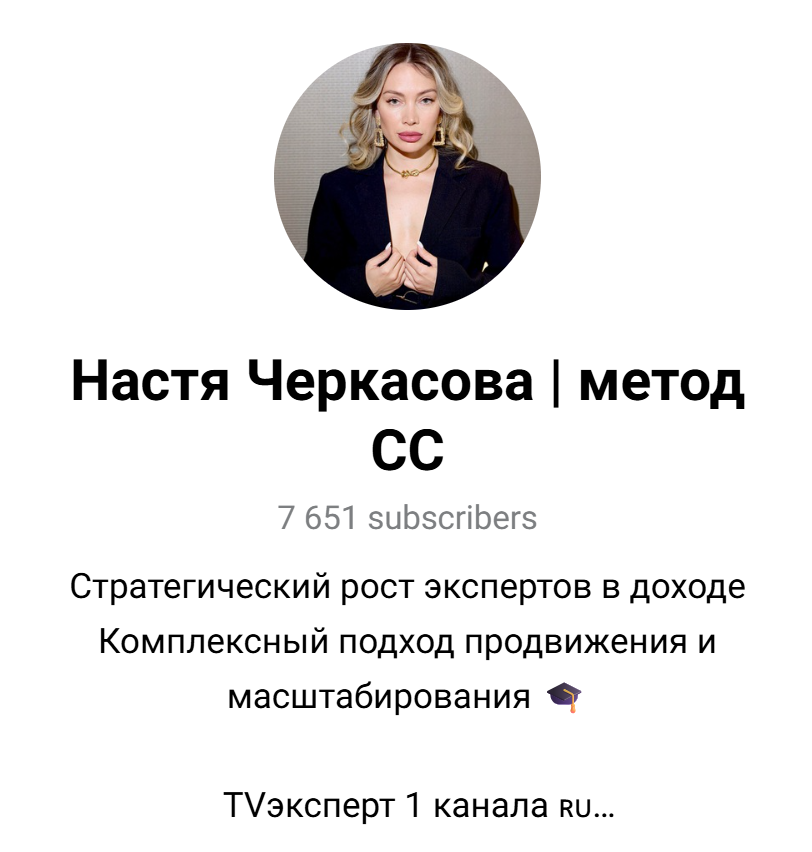 В дополнение к официальному сайту девушка ведет канал в Телеграм под названием Настя Черкасова Метод СС. Сообщество доступно по ссылке Nastitutor и сумело собрать около 7,6 тыс. пользователей. В описании сказано, что девушка рассказывает о стратегическом росте экспертов в вопросах прибыли. Также приводится комплексный подход в вопросах масштабирования и продвижения.