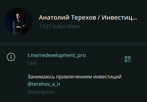 Канал Анатолий Терехов Инвестиции под ником Redevelopment pro появился в Телеграмм в 2023 году. Его автор Terehov A N позиционирует себя как опытного инвестора с большим стажем. Однако нигде в канале нет подтверждений его слов.