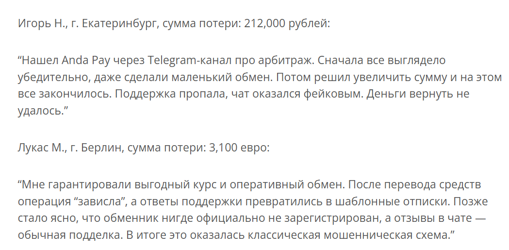 Также пользователи отмечают, что чат с отзывами оказался фиктивным, а активность в нем создавалась искусственно. В ряде случаев люди уже после потери средств выясняли, что обменник нигде официально не зарегистрирован и не имеет права оказывать финансовые услуги.