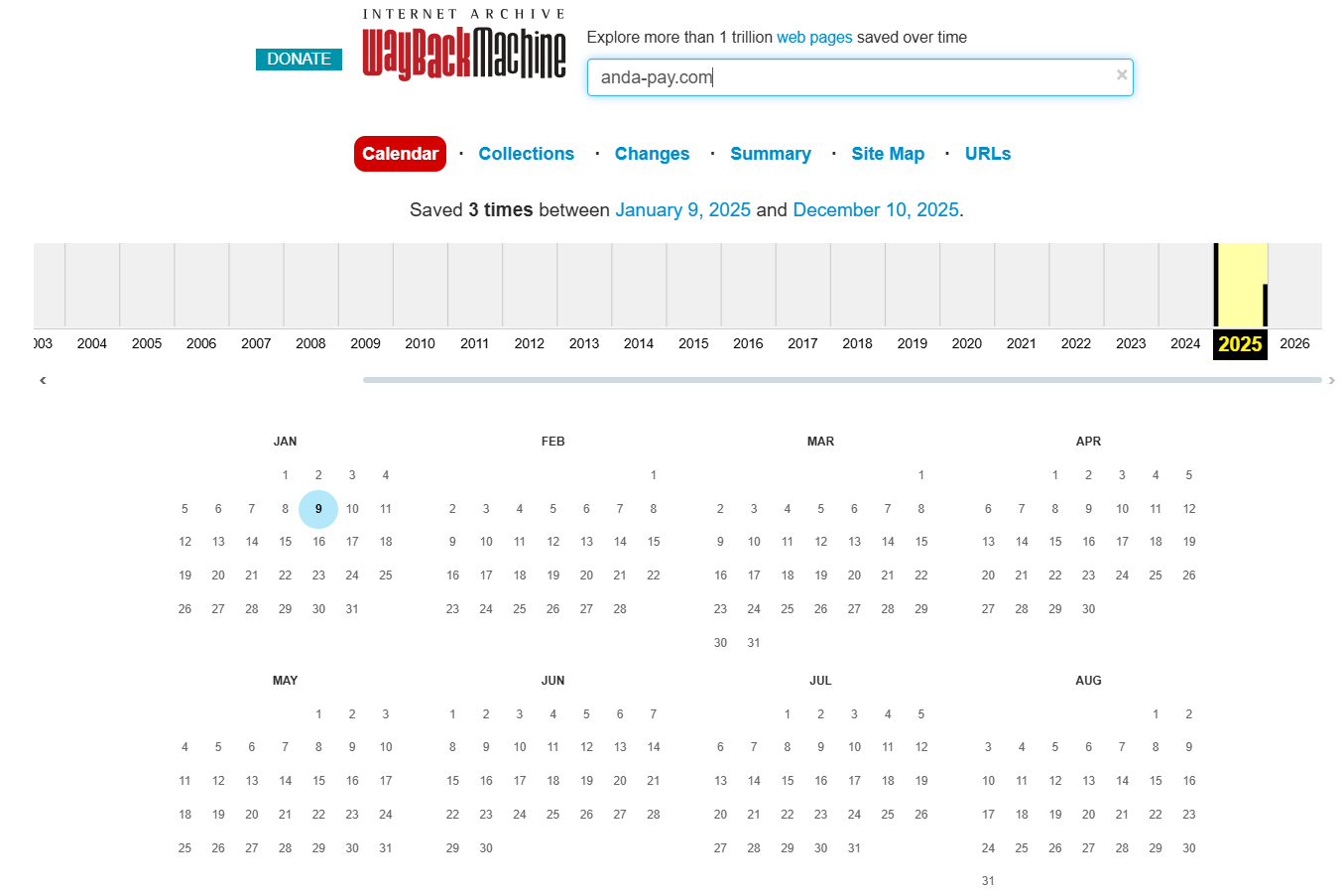 Однако при проверке истории сайта начинаются вопросы. Wayback Machine показывает всего три сохранения, все они относятся к 2025 г., при этом при попытке открыть сохраненные копии страницы архив либо не отображает содержимое, либо выдает ошибку.